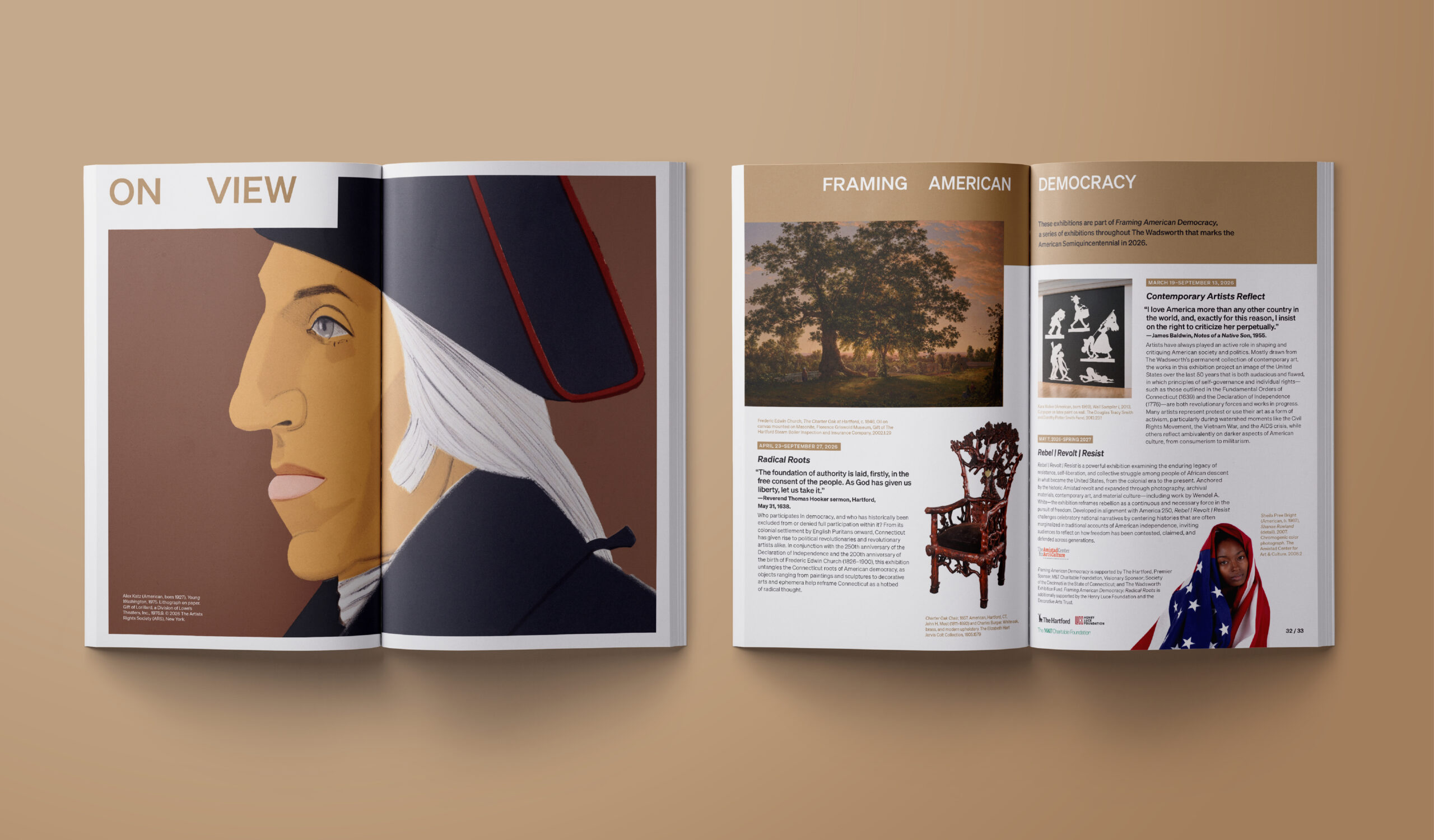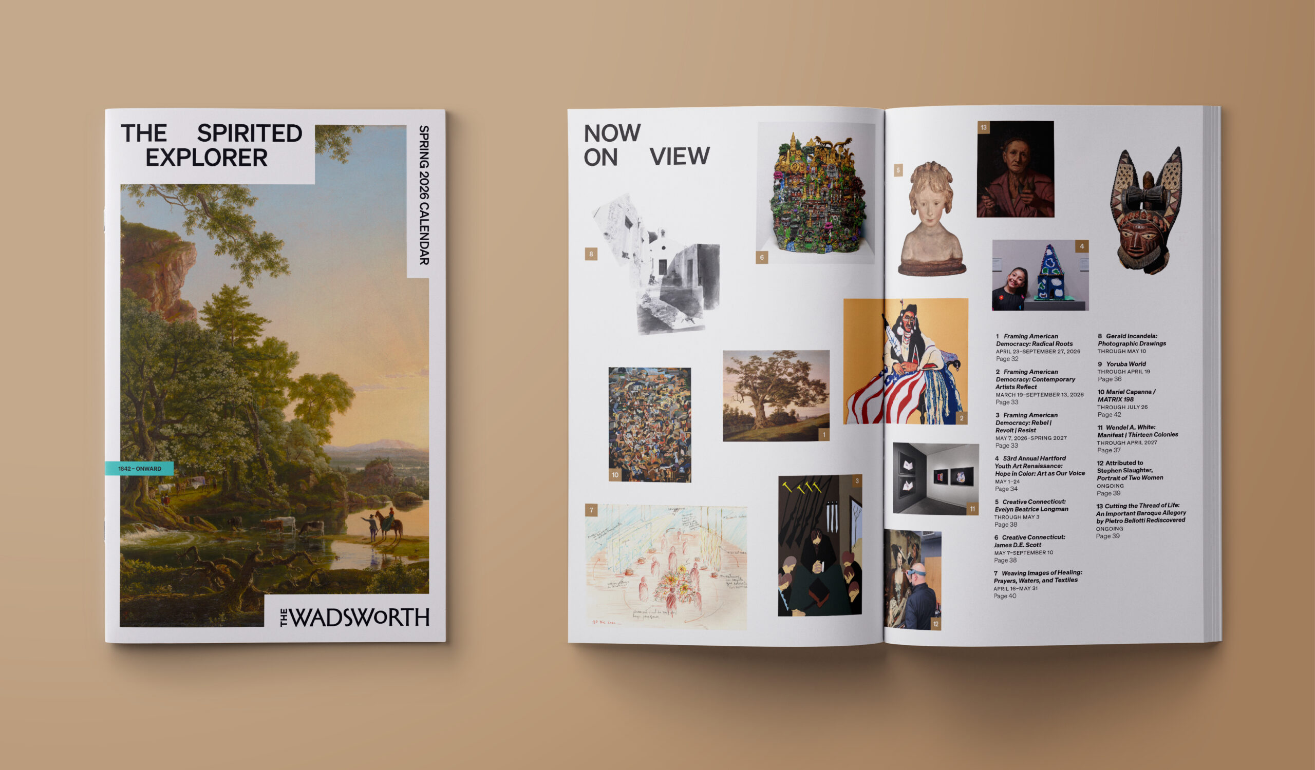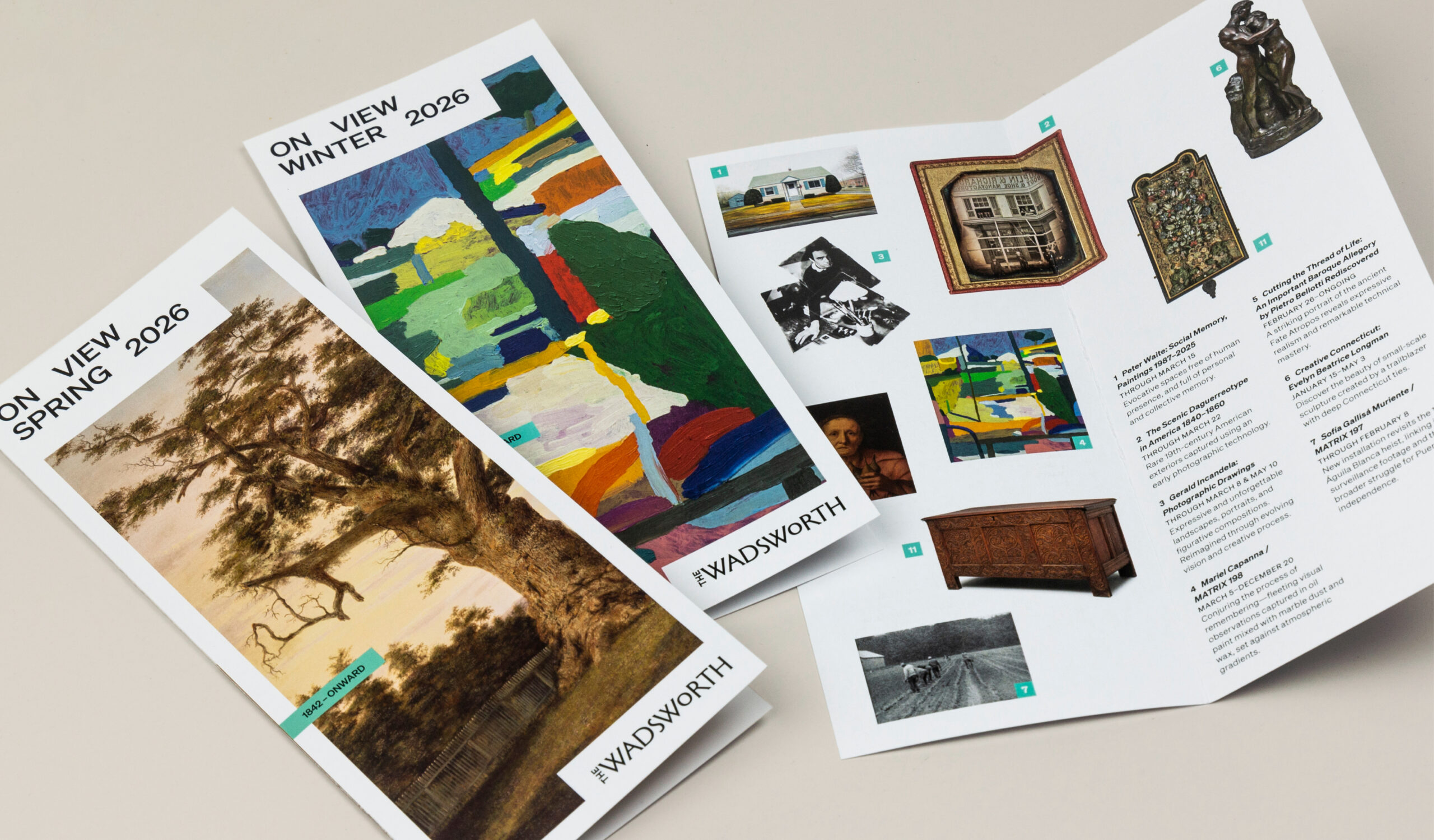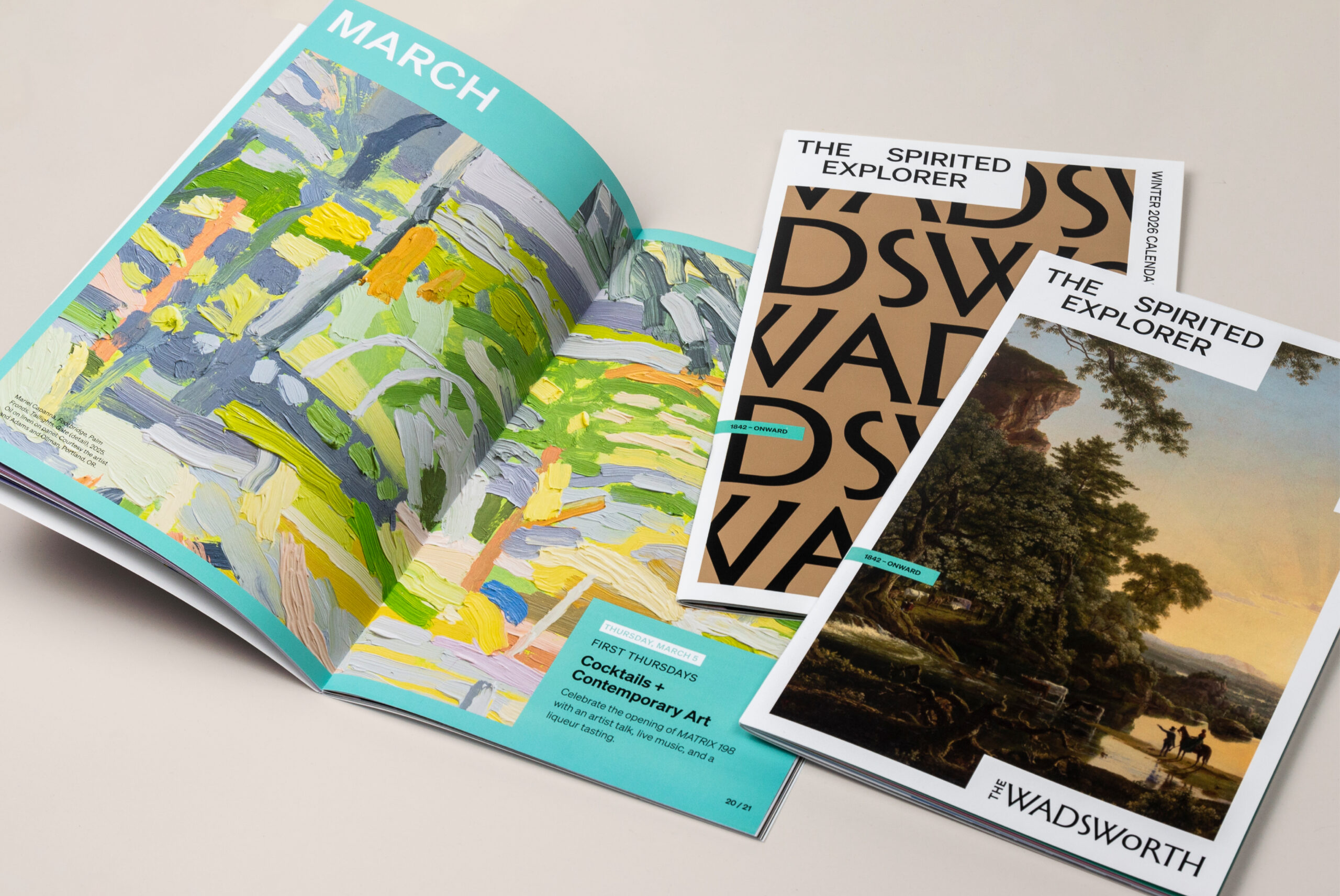 Stoltze Design Group has partnered with The Wadsworth on various exhibition branding and publication projects since 2023. In 2025, the museum worked with Saffron, the London- and Madrid-based branding agency, to create a new identity. Stoltze Design was charged with enhancing and expanding the new brand across a wide range of applications, such as entry banners, exhibition graphics, advertising, and marketing materials, including the quarterly calendar redesign and assorted swag for their gift shop.