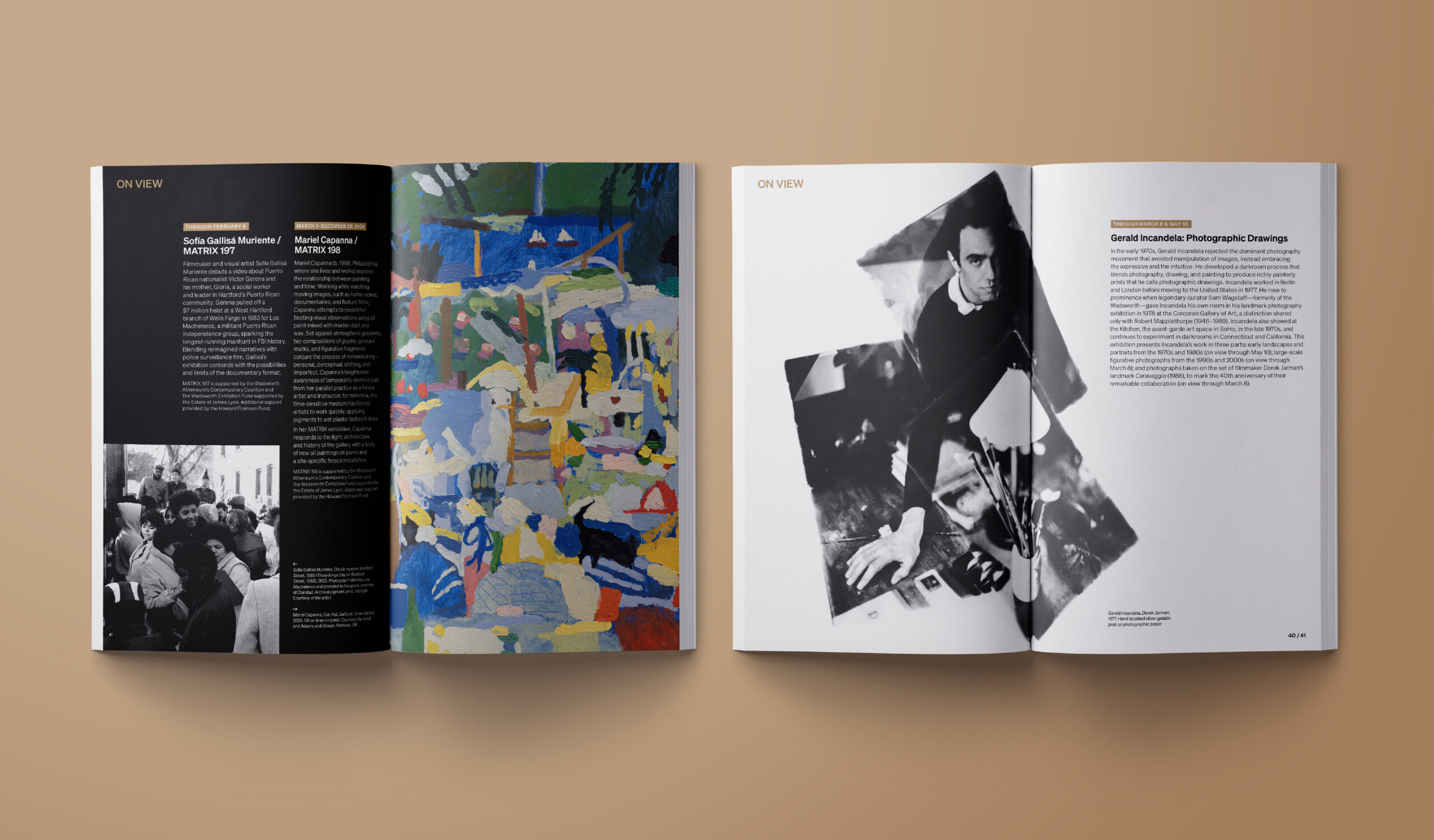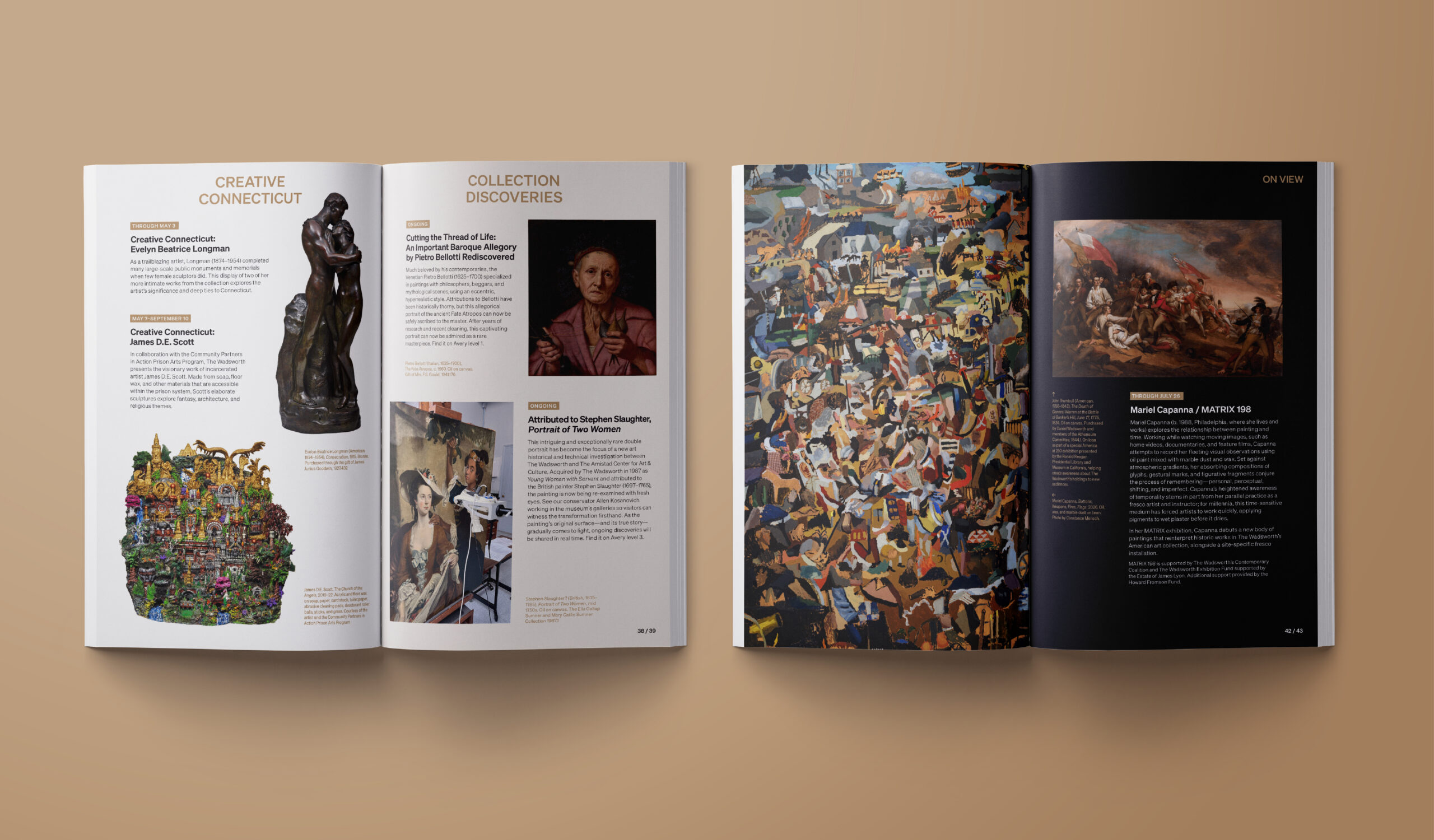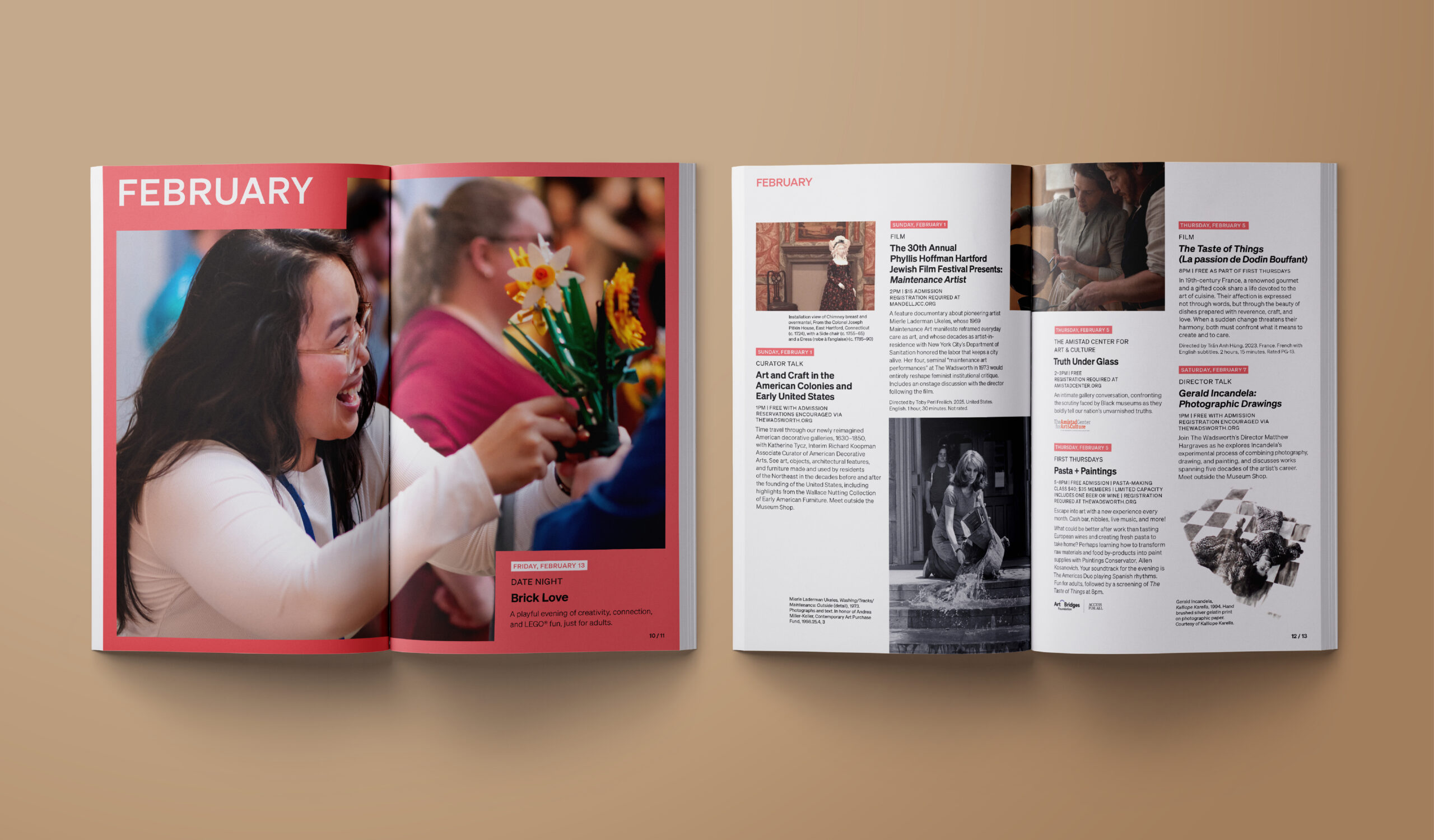 Stoltze Design Group has partnered with The Wadsworth on various exhibition branding and publication projects since 2023. In 2025, the museum worked with Saffron, the London- and Madrid-based branding agency, to create a new identity. Stoltze Design was charged with enhancing and expanding the new brand across a wide range of applications, such as entry banners, exhibition graphics, advertising, and marketing materials, including the quarterly calendar redesign and assorted swag for their gift shop.