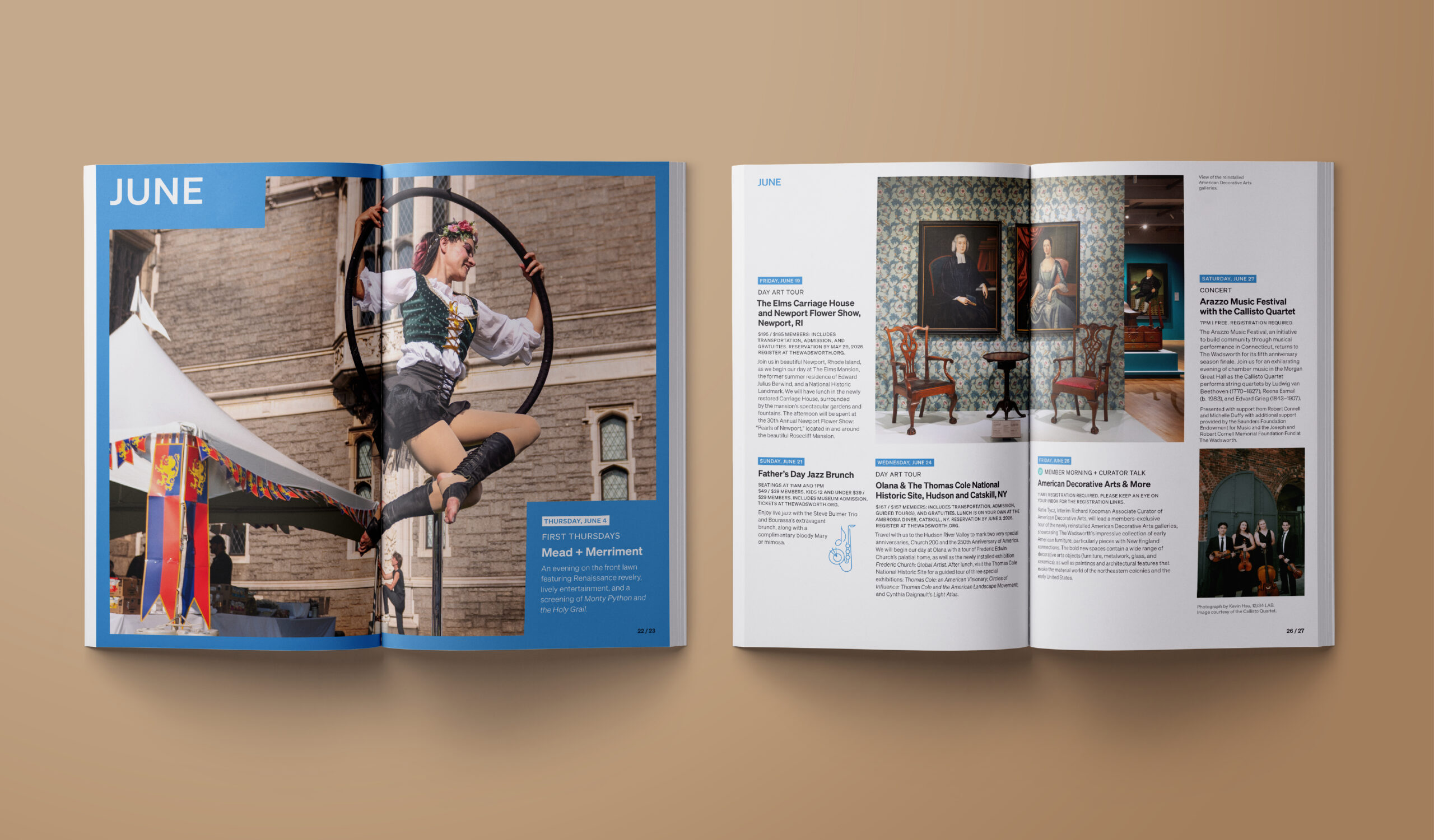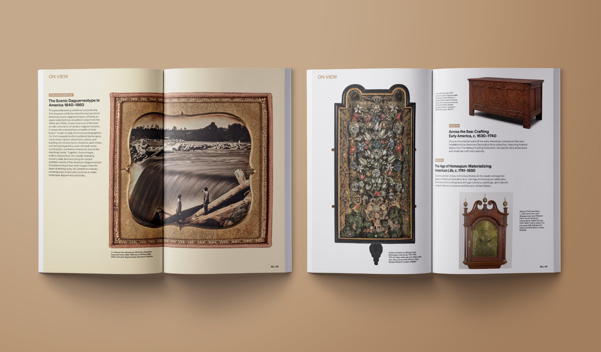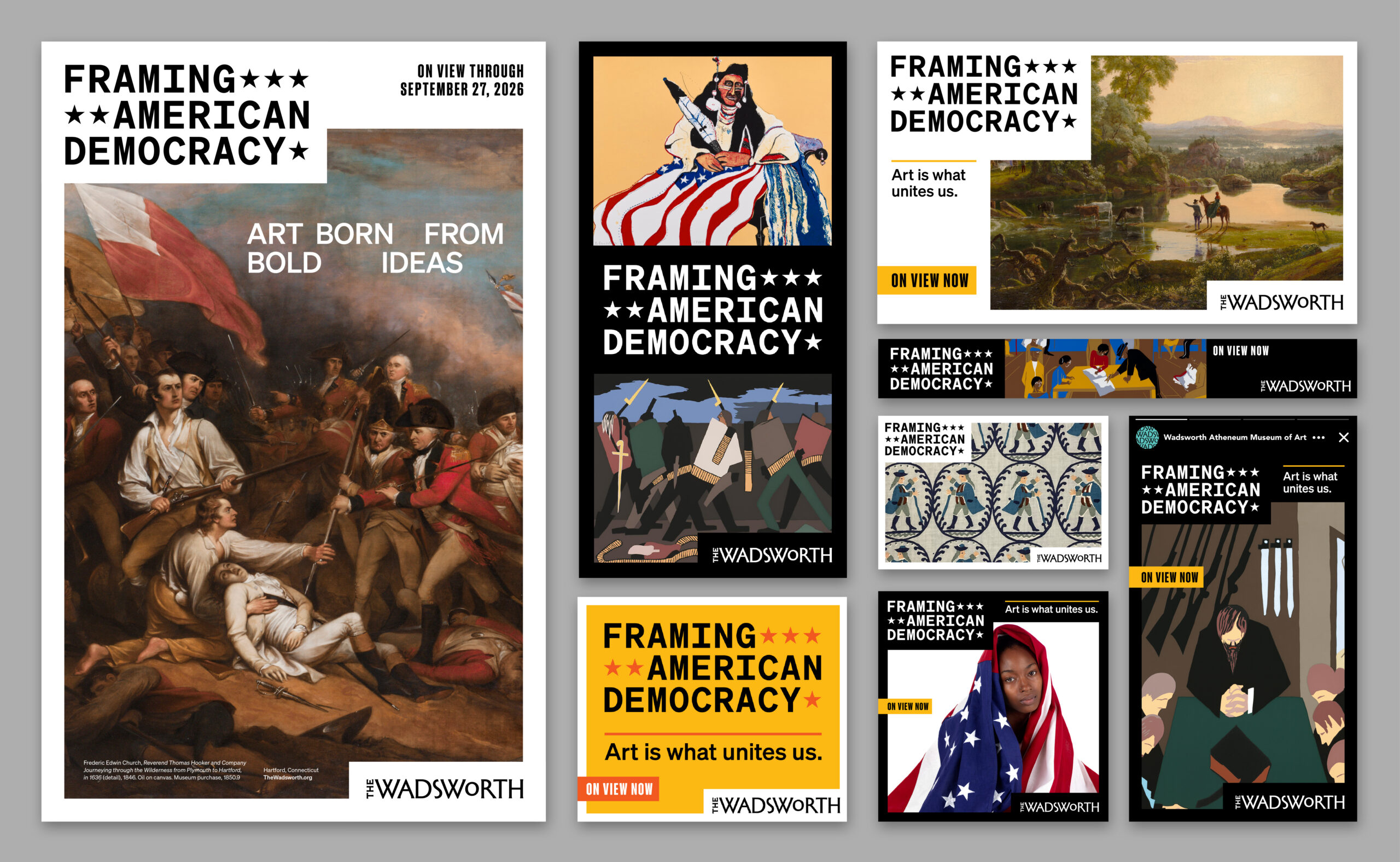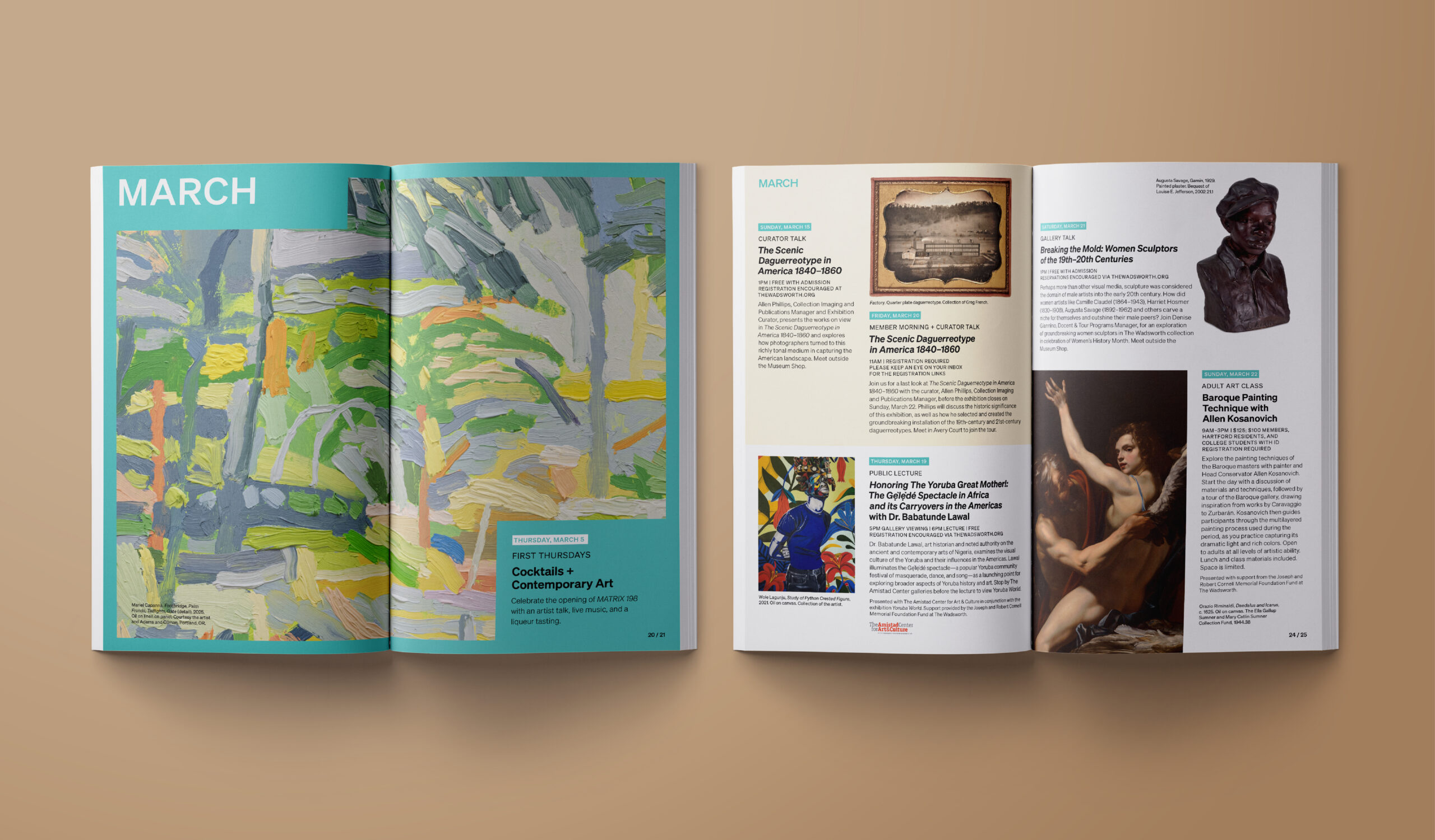 Stoltze Design Group has partnered with The Wadsworth on various exhibition branding and publication projects since 2023. In 2025, the museum worked with Saffron, the London- and Madrid-based branding agency, to create a new identity. Stoltze Design was charged with enhancing and expanding the new brand across a wide range of applications, such as entry banners, exhibition graphics, advertising, and marketing materials, including the quarterly calendar redesign and assorted swag for their gift shop.